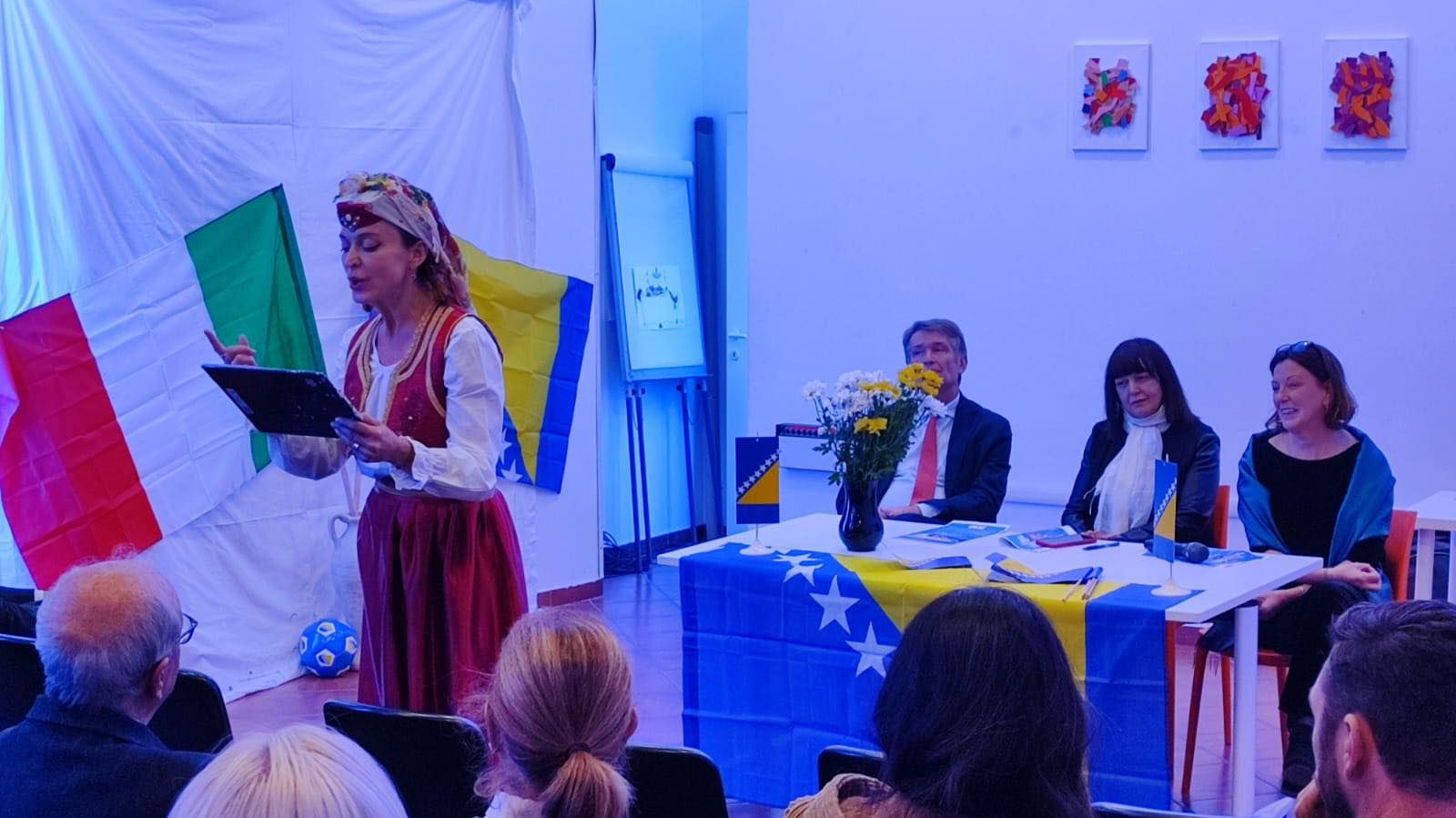 Posebno je izrazila zahvalnost na govoru i učešću Azri Popović, savjetnici pri Ambasadi BiH u Rimu, i profesoru Nadanu Petroviću, koji je napravio jednu kratku historijsku panoramu naše domovine BiH.