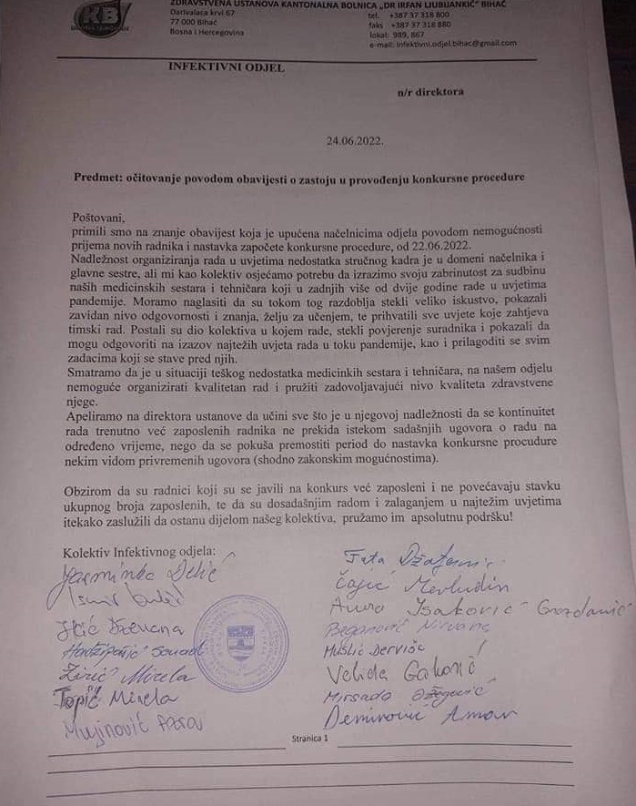 Kako se navodi u saopštenju Kolektiva infektivnog odjela, to osoblje je steklo praksu i određena znanja posebno kada su pandemijska stanja u pitanju i bila bi ogromna šteta da se taj kadar ne zadrži na ovom odjelu, a posebno kada znamo da gotovo svakodnevno imamo odlkaske naših medicinskih kadrova u zemlje EU.