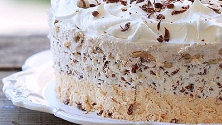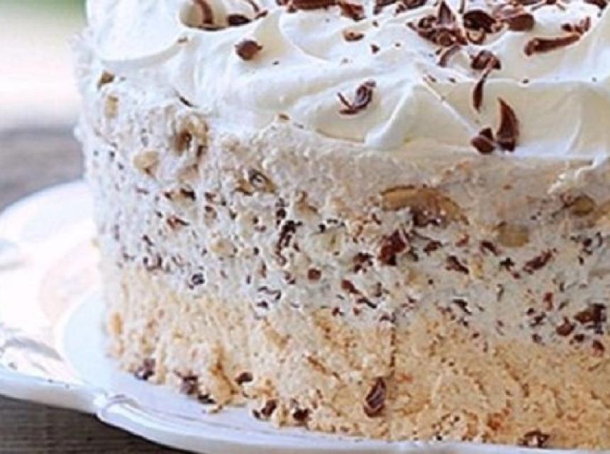 4. Odozgo umutiti 100 g šlag kreme i posuti sjeckanim orasima. Staviti ponovo u zamrzivač da se dobro ohladi.