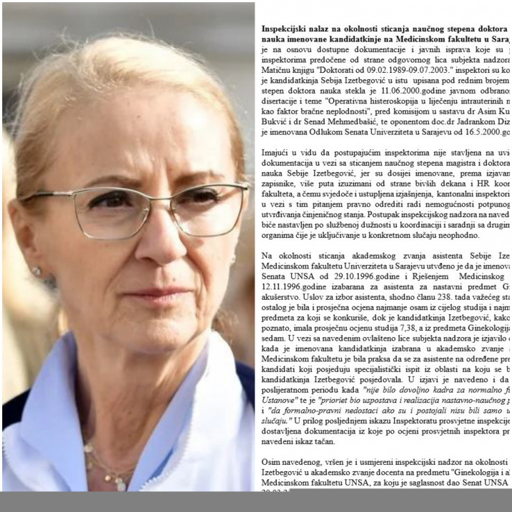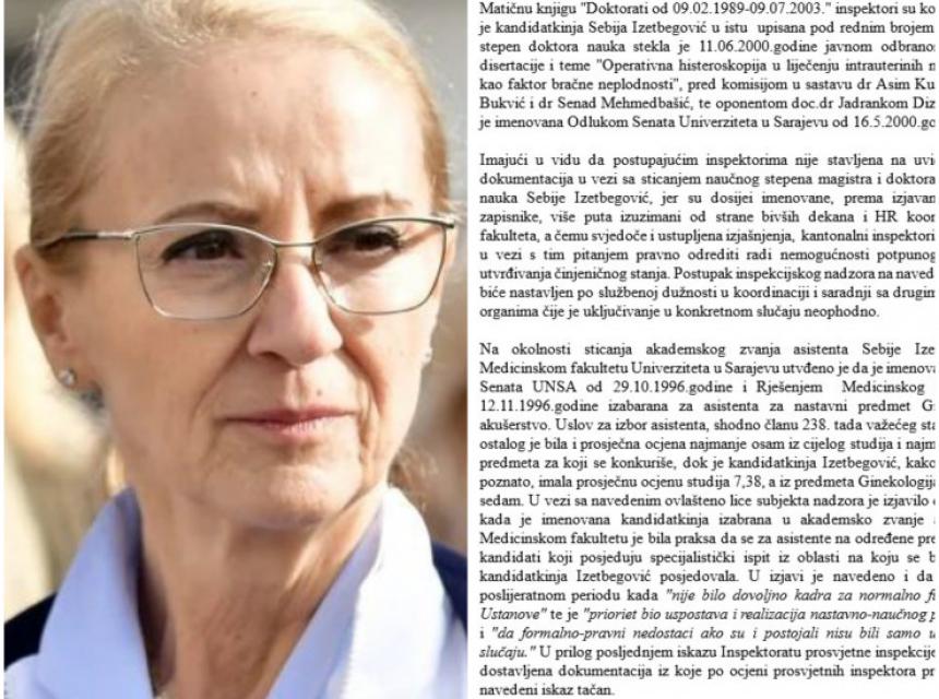 Iz inspekcije kažu da je na osnovu dokumentacije koja je stavljena na uvid, postupajući inspektori mogli su utvrditi činjenično stanje prema kojem je kandidat Sebija Izetbegović diplomu doktora medicine na tom fakultetu stekla 1989.godine.