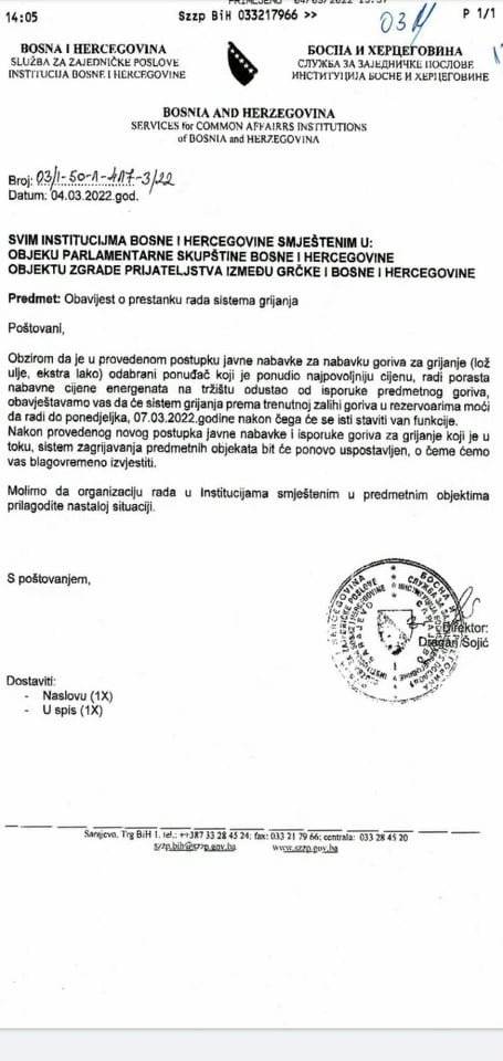 U obavještenju koje je prije dva dana upućeno svim institucijama Bosne i Hercegovine u objektu Parlamentarne skupštine BiH i Zgradi prijateljstva između Grčke i BiH navodi se da će od sutra prestati sa radom grijanje u tom objektu.