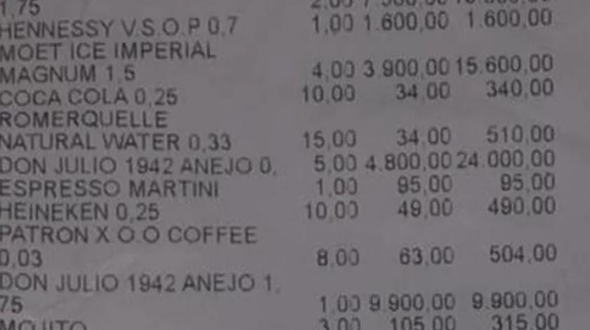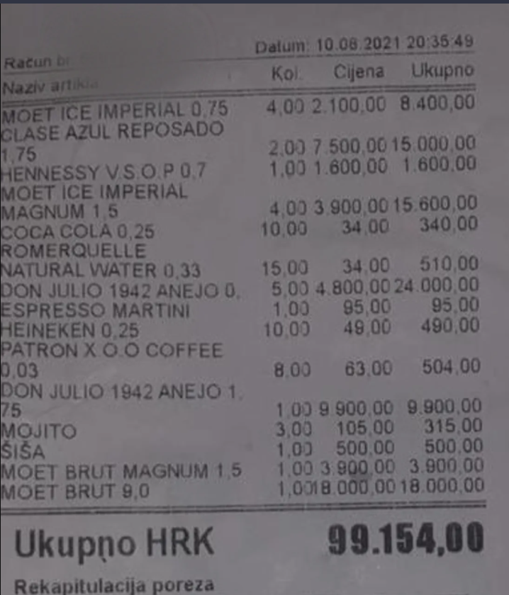 Kaže da su neki gosti u utorak navečer na pića potrošili gotovo stotinu tisuća kuna, pri čemu je najviše otišlo na pet boca tekila Don Julio Anejo, čak 24 tisuće kuna.