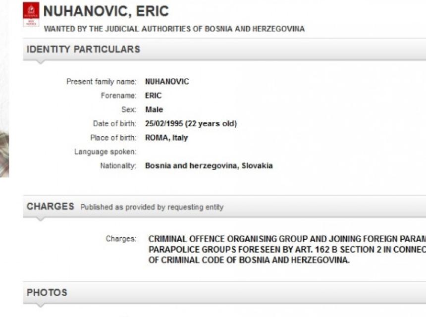 Međunarodna policijska agencija Interpol objavila je crvenu potjernicu za Erikom Nuhanovićem (Eric), 22-godišnjim državljaninom, koji je rođen u Rimu.
