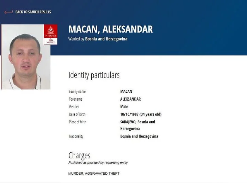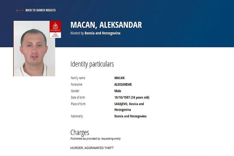 Prvo je Tužilaštvo KS izdalo naredbu za raspisivanjem međunarodne potjernice, a zatim je Interpol i stavio Macana na listu traženih osoba.