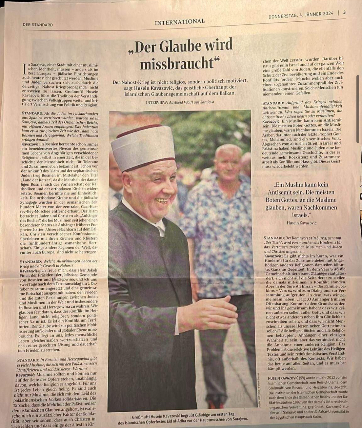 Reisu-l-ulema Islamske zajednice u Bosni i Hercegovini Husein-ef. Kavazović dao je intervju austrijskom listu Der Standard u kojem je, između ostalog, govorio o međureligijskim odnosima nakon eskalacije nasilja u Gazi i na Bliskom istoku.