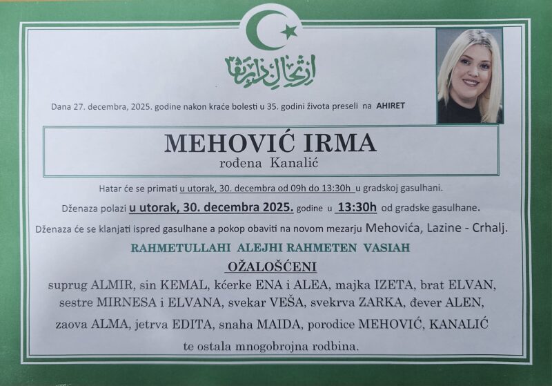 Prema informacijama iz porodice, Irma je preselila na Ahiret 27. decembra 2025. godine. Hatar će se primati u utorak, 30. decembra, od 9 do 13:30 sati u gradskoj gasulhani. Dženaza-namaz polazi istog dana u 13:30 sati ispred gradske gasulhane, a ukop će se obaviti na novom mezarju porodice Mehović u mjestu Lazine – Crhalj.