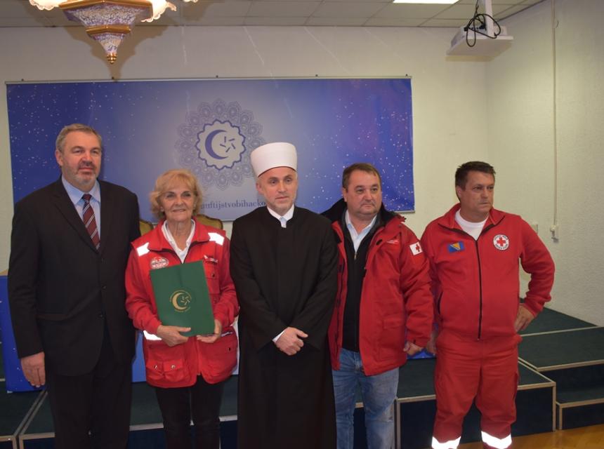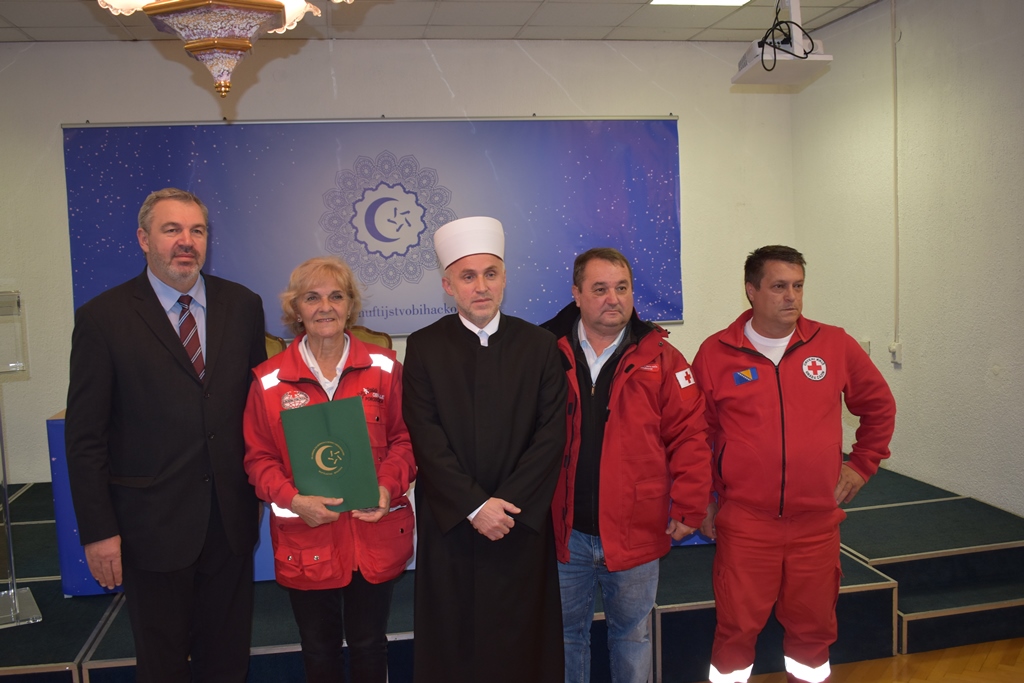 Predsjednik crvenog križa je uručio muftiji bihaćkom hafizu Mehmed-ef. Kudiću zahvalnicu za angažman i posvećenost muftijstva u pomoći onima o kojima se brine Crveni križ.