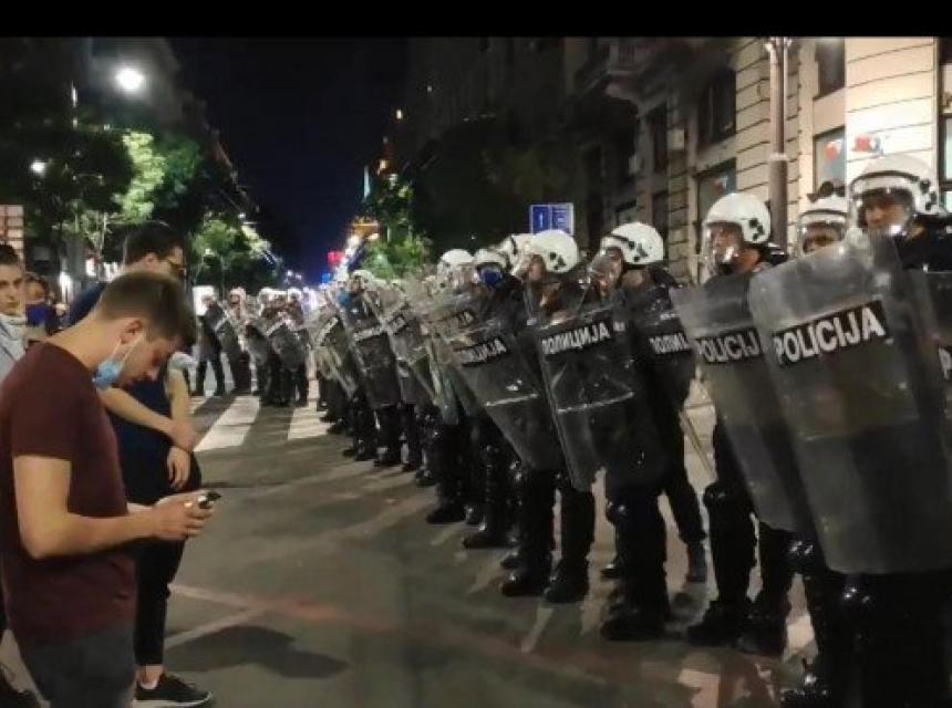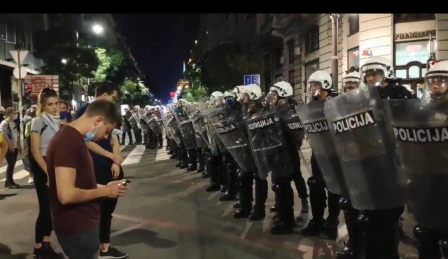 Jedan od momaka koji je sinoć protestovao u centru Beograda protiv Vučićevog režima, džentlmenskim potezom upitao je policajce da li ih je sramota da nose štitove i budu sluge režima i pročitao im je nekoliko afera vlasti u posljednjih nekoliko godina.