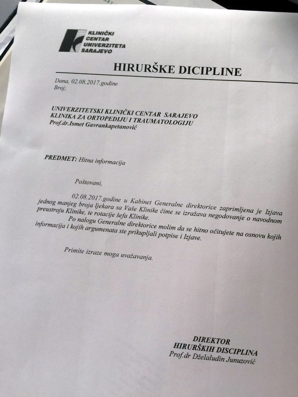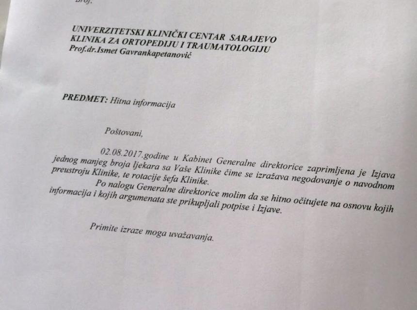 „U Kabinetu generalne direktorice zaprimljena je izjava ljekara sa vaše Klinike čime se izražava negodovanje o navodnom preustroju Klinike te rotaciji šefa Klinike. Po nalogu generalne direktorice molim vas da se hitno očitujete na osnovu kojih informcija i kojih argumenata ste prikupljali potpise i izjave“, navodi se u dopisu dr. Junuzovića.