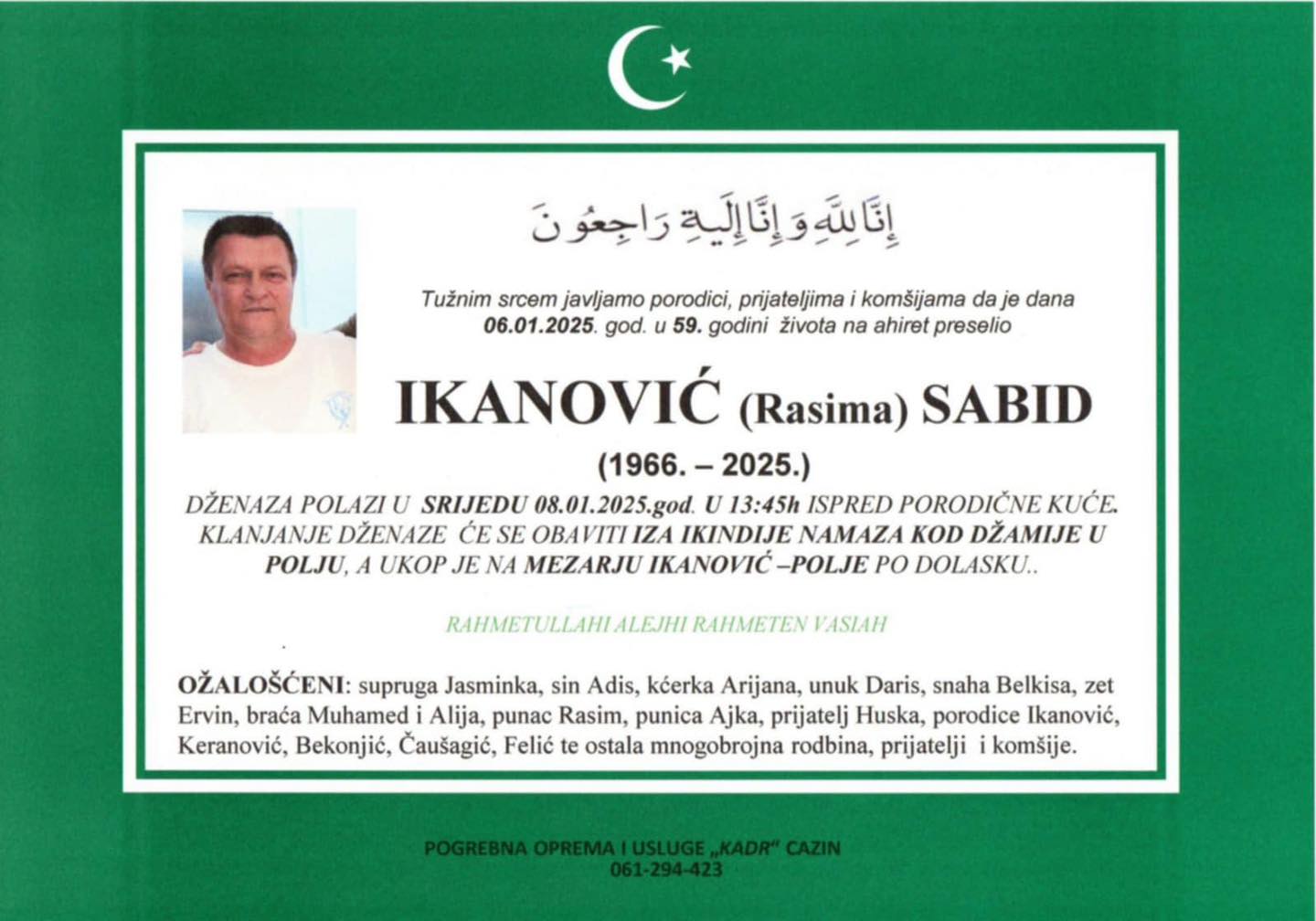 Duboko ožalošćeni obavještavamo rodbinu, prijatelje i komšije da je dana 06.01.2025. god. u 59-oj godini života na ahiret preselio Ikanović (Rasima) Sabid.