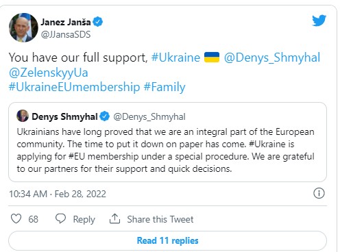 Imate našu punu podršku – tvitovao je Janša, koji je zajedno sa poljskim premijerom Mateuszom Morawieckijem prošle sedmice pozvao Evropsko vijeće da donese “brze i hrabre odluke” o prijemu Ukrajine u EU.