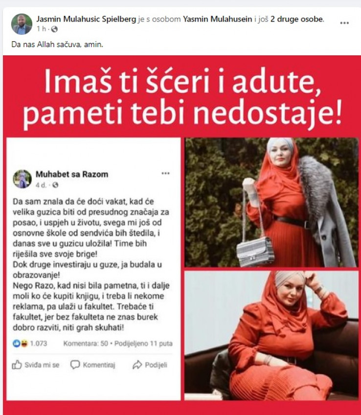 Mulahusić je podijelio jednu od Razijinih objava uz komentar "Da nas Allah sačuva, amin", aludirajći na Razinu objavu ukojoj se referira na propast društva u kojem je za zaposlenje žene važno da ima, kako je napisala Raza, veliku guz**u.