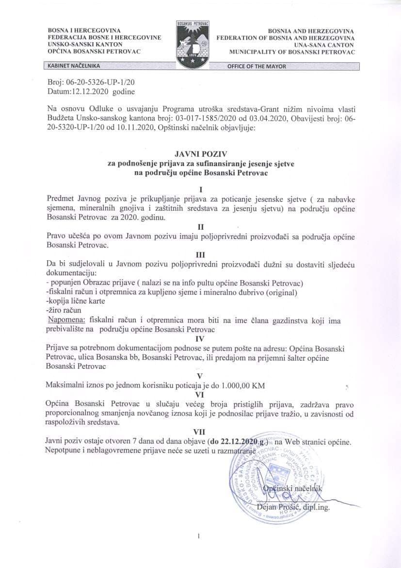 Predmet poziva je prikupljanje prijava za poticanje jesenje sjetve na području općine Bosanski Petrovac.
