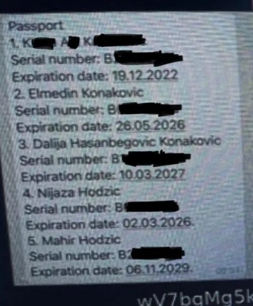 Nepuna dva mjeseca kasnije, tačnije, 14. februara 2021. godine, Kadrić šalje ceduljicu na kojoj su ispisani brojevi pasoša Elmedina Konakovića, njegove kćerke K.A.K., Dalije Hasanbegović-Konaković, Nijaze Hodžić i Mahira Hodžića.