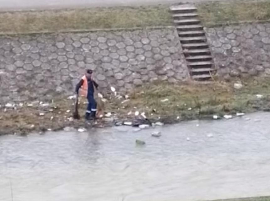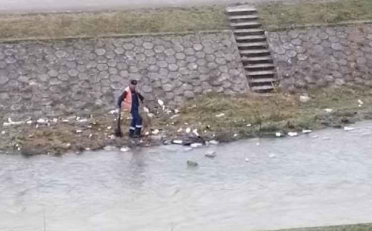 Naime, kako se na snimku vidi, čovjek u fluoroscentnom prsluku, za kojeg se pretpostavlja da je čistač, umjesto da očisti obalu rijeke od smeća, on otpad gura u rijeku, a potom ga voda odnosi.