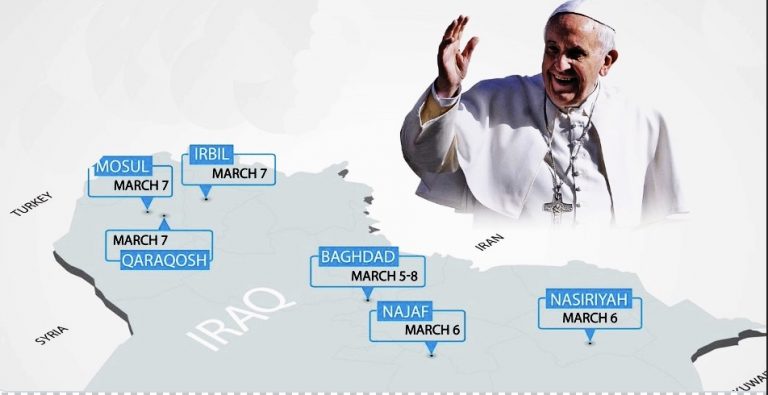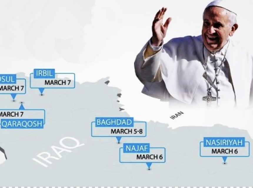 Posjeta pape Franje Iraku trajala je 3 dana, tokom koje se sastao sa iračkim predsjednikom Barham Salihom u Bagdadu i sa šiijskim vođom ajatolahom Ali el-Sistanijem u Nedžefu, da bi svoju posjetu zaključio sastankom s predsjednikom sjevernog Iraka, Nechirvanom Barzanijem u Erbilu.