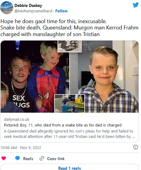 Tristan Fram je imao 11 godina kada je naišao na reptila u regionu Saut Barnet u novembru 2021. godine, umro je nekoliko sati kasnije.