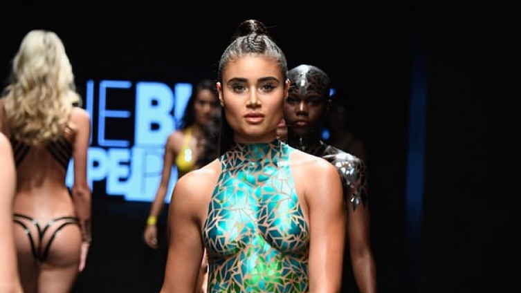 Manekenke su nosile niz otkačenih kreacija. Desetine komadića ljepljive trake su zalijepljene na njihovu kožu imitirajuću kupaće kostime i donji veš.