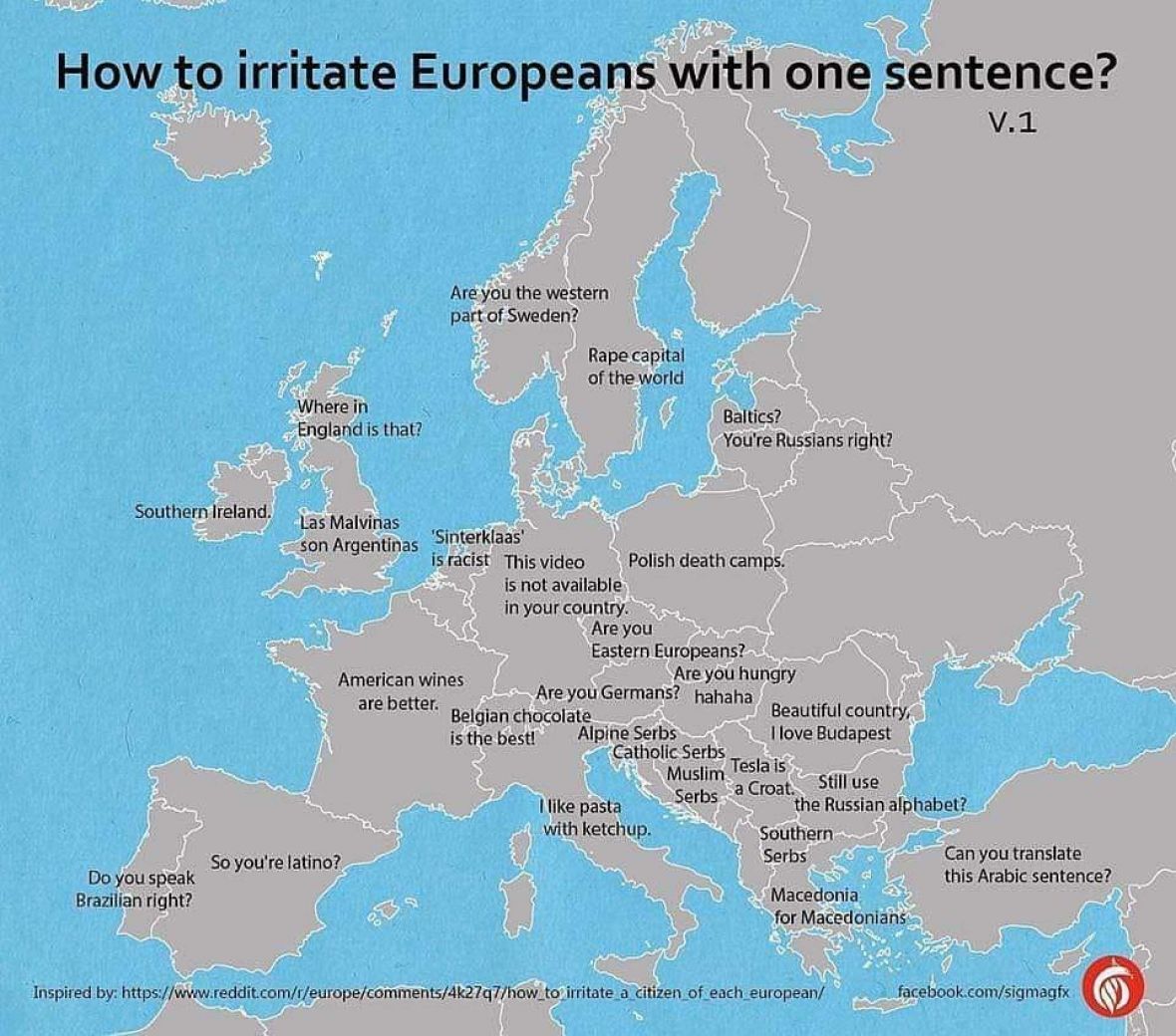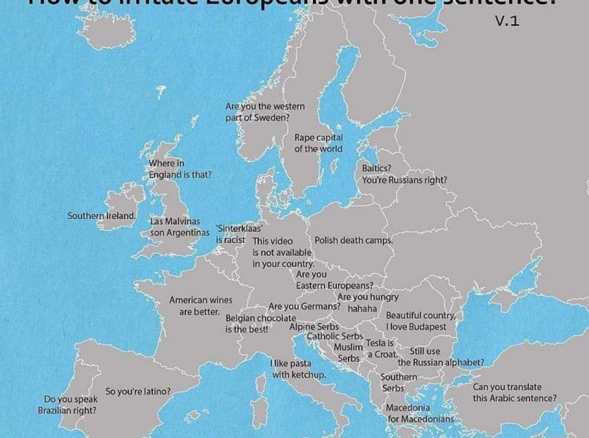 Društvenim mrežama proširila se karta na koju je neko duhovito iznad svake države napisao kako u jednoj rečenici naživcirati stanovnike te države.