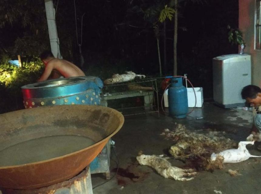 5. Životinje ubijaju prebijanjem, paljenjem ili drugim bolnim metodama, u uvjerenju da će tako meso biti ukusnije. Psima na živo skidaju kožu, udaraju ih čekićima, sijeku ih motornim testerama, stavljaju u vrelo vodu ili spaljuju (dok su još živi).