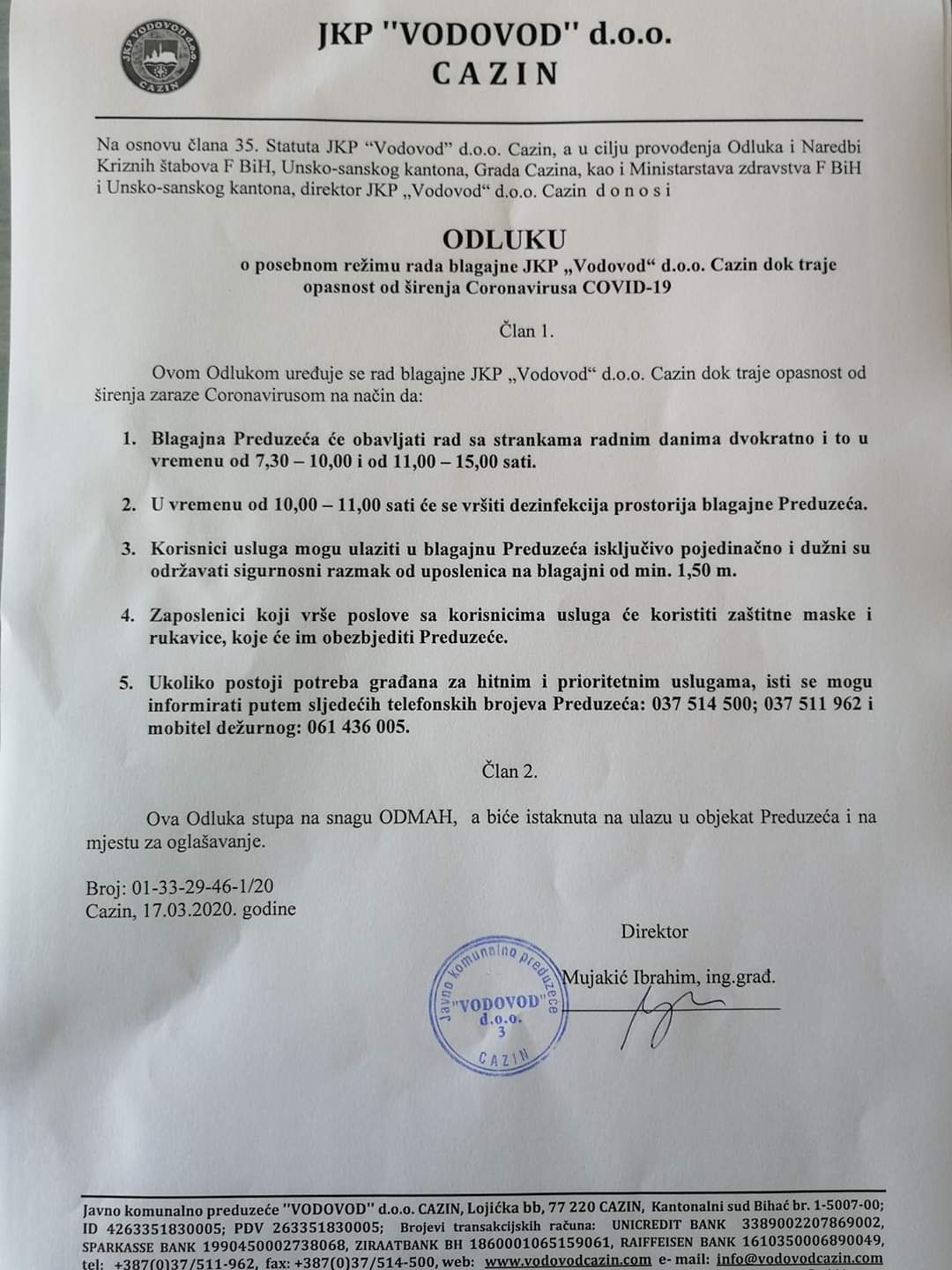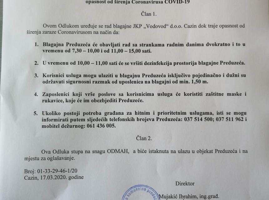 JKP “Čistoća” d.o.o. Cazin je dana 17.03.2020.godine donijela Odluku o posebnom režimu rada dok traje opasnost od širenja Coronavirusa – COVID-19.