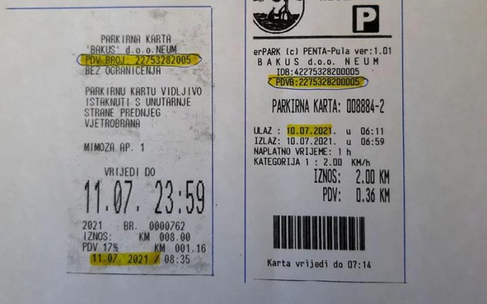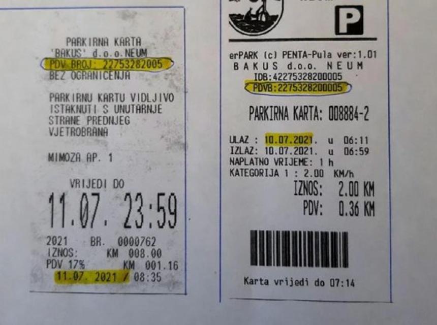 Naime, na središnjem parkingu na kartama se nalazi PDV broj s 13 brojeva, a na kartama kupljenim na uličnim automatima s PDV-brojem od 11 brojeva. Te ulične karte, s umanjenim poreznim brojem, čine oko 90 posto naplate parkinga i čak ne predstavljaju fiskalni račun.