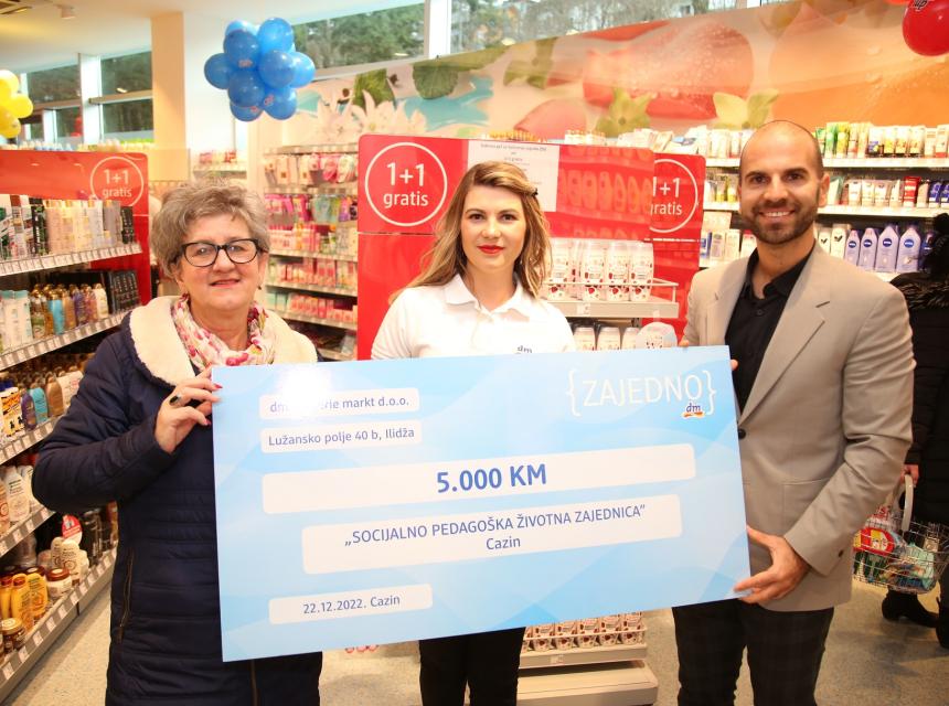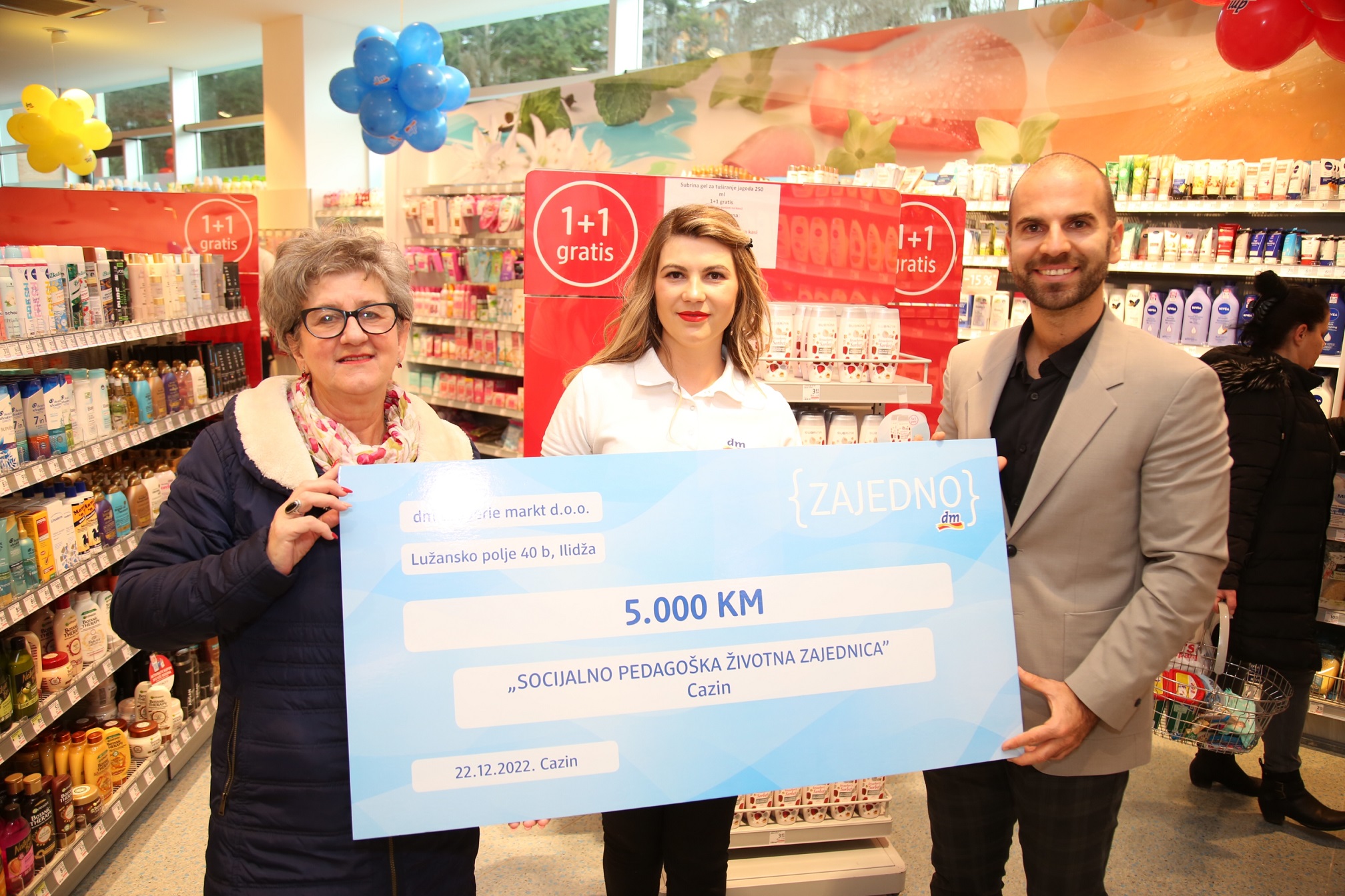 Otvorenje preuređene dm prodavnice i ovaj put bio je povod da kompanija pomogne lokalnoj zajednici te je donacija u iznosu od 5.000 KM uručena JU „Socijalno-pedagoška životna zajednica“ Cazin. Ova Ustanova, još od 2000. godine, djeci bez roditeljskog staranja nastoji pružiti dom, sigurnost, ljubav i pažnju, kako bi izrasli u zdrave i sposobne osobe korisne i sebi i društvu.