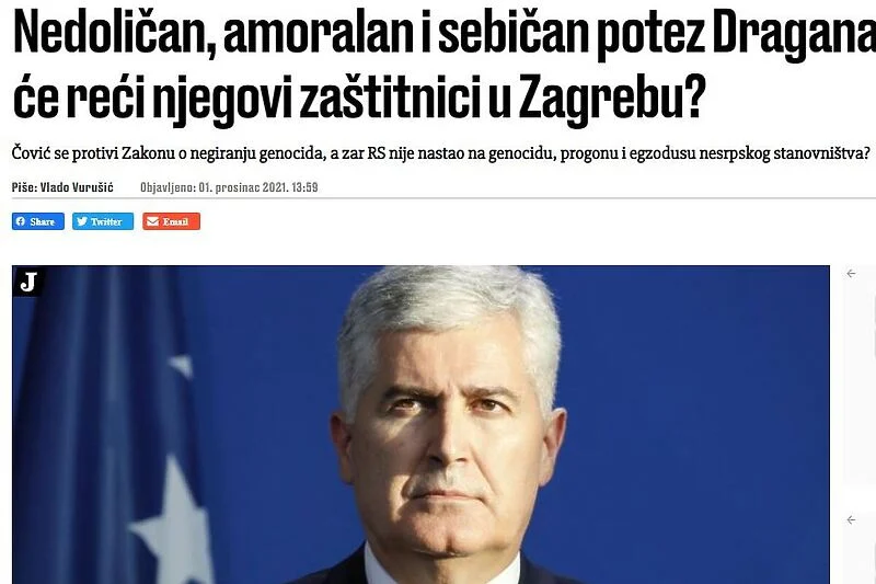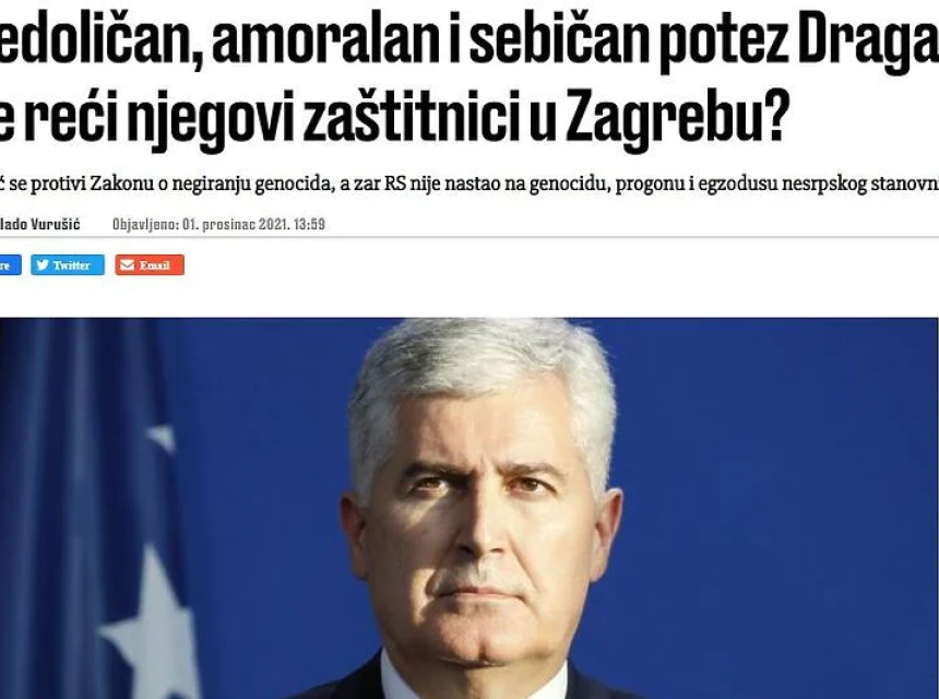 "Je li to i njihov stav? Uz to što je to nedoličan i amoralan potez, učinjen očito zbog izbornog zakona kako bi Čović sebi osigurao vječno mjesto u Predsjedništvu BiH, ovo je i pitanje za Banske dvore i Pantovčak - vodi li Čović hrvatsku politiku prema susjednoj državi ili bi to trebao Plenković s jasnim stavom o cjelovitosti i jedinstvenoj BiH. Ta odluka traži reakciju spomenutih Čovićevih patrona i zaštitnika u Zagrebu, koji su inače, kao i sam Čović, s pravom odlazili u Potočare na obilježavanje obljetnica srebreničkog genocida", piše u tekstu.
