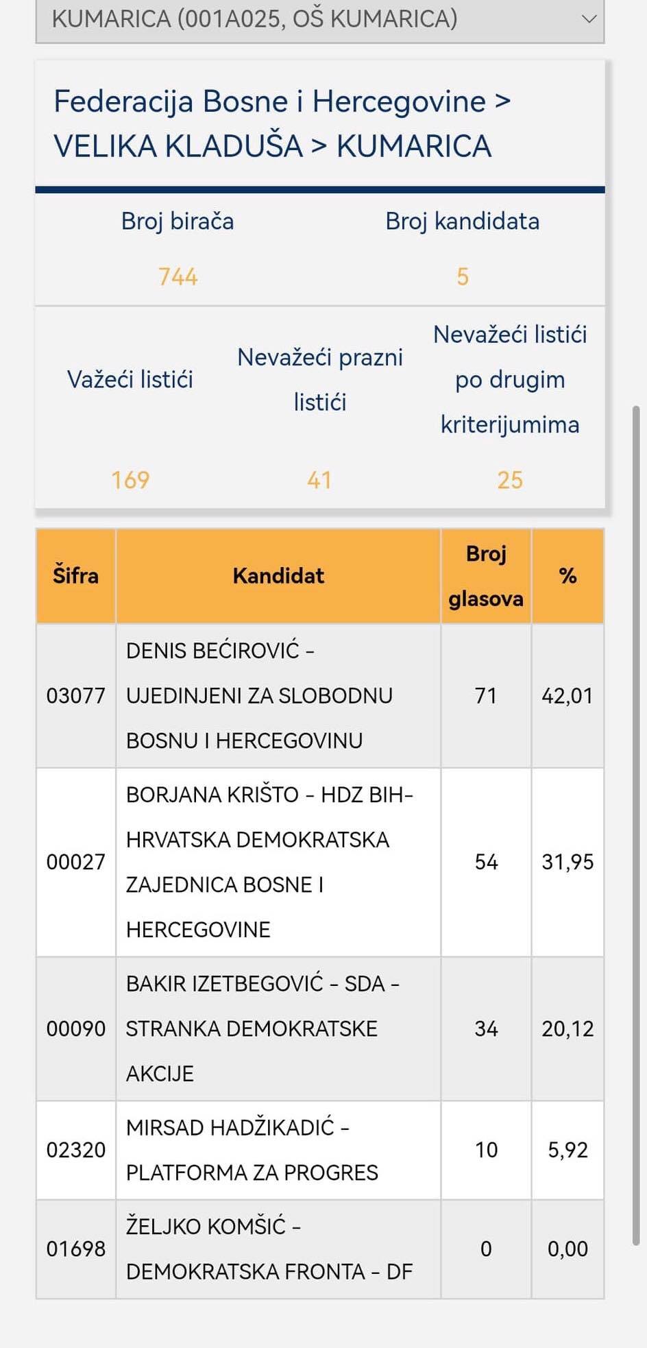 Radi se o tome da je ovo naselje gdje postoji 7 Hrvata, gdje je 31%, ljudi izašlo na glasanje, te je Borjana Krišto, kandidatkinja HDZ-a dobila 54 glasa, a Željko Komšić niti jedan.