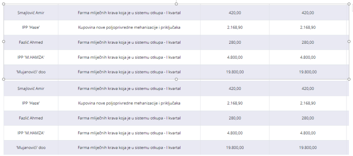Iz Registra se vidi da je Mujanovići d.o.o. dobio poticaj po 33 tačke, za uzgoj teladi, za tov junadi, plasteničku proizvodnju, uzgoj priplodnih junica… Najniži tranša poticaja je 440 KM, a najviše 58.400… I tako nekoliko puta.