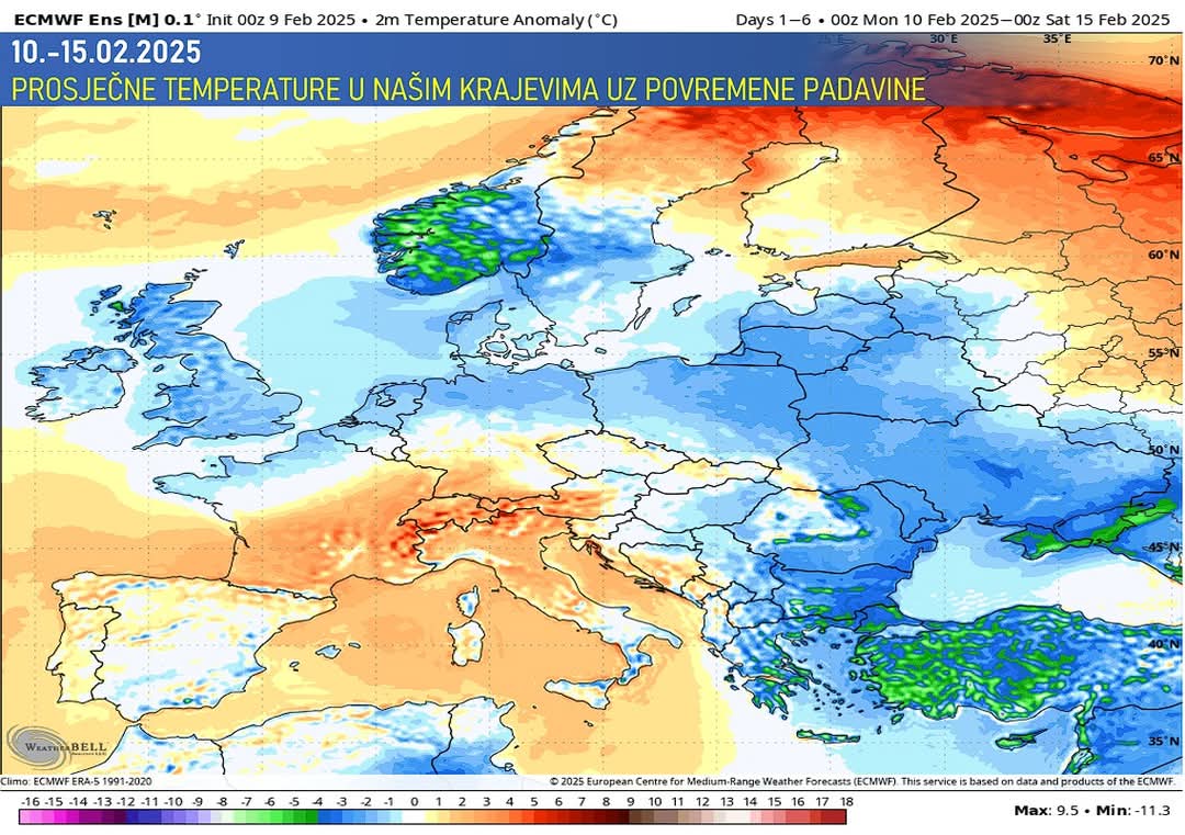 Jutarnja temperatura u utorak između -2 i 3, na jugu do 7 °C. Dnevna temperatura između 3 i 8, na jugu do 12 °C. Većinom slab vjetar, na sjeveroistoku Bosne lokalno povremeno umjeren istočni vjetar.