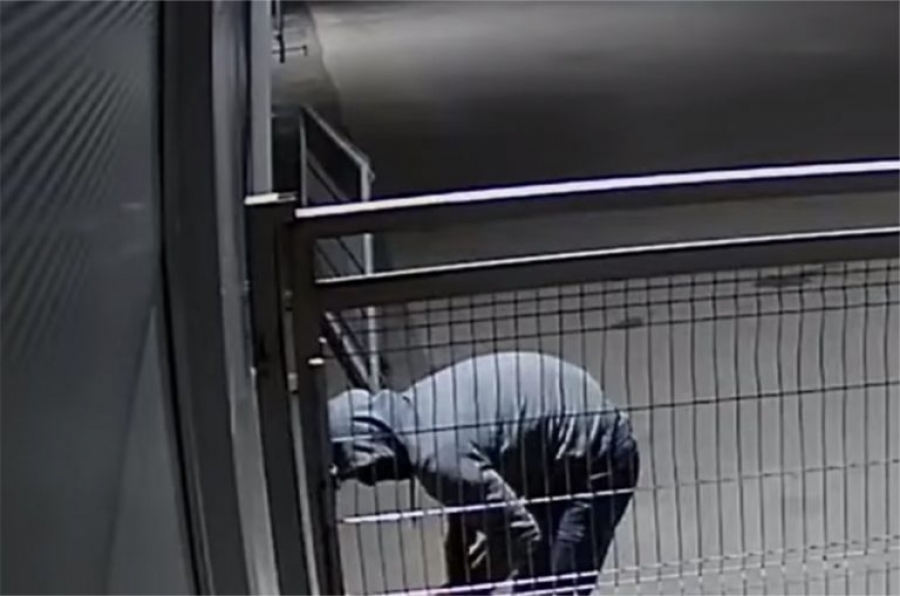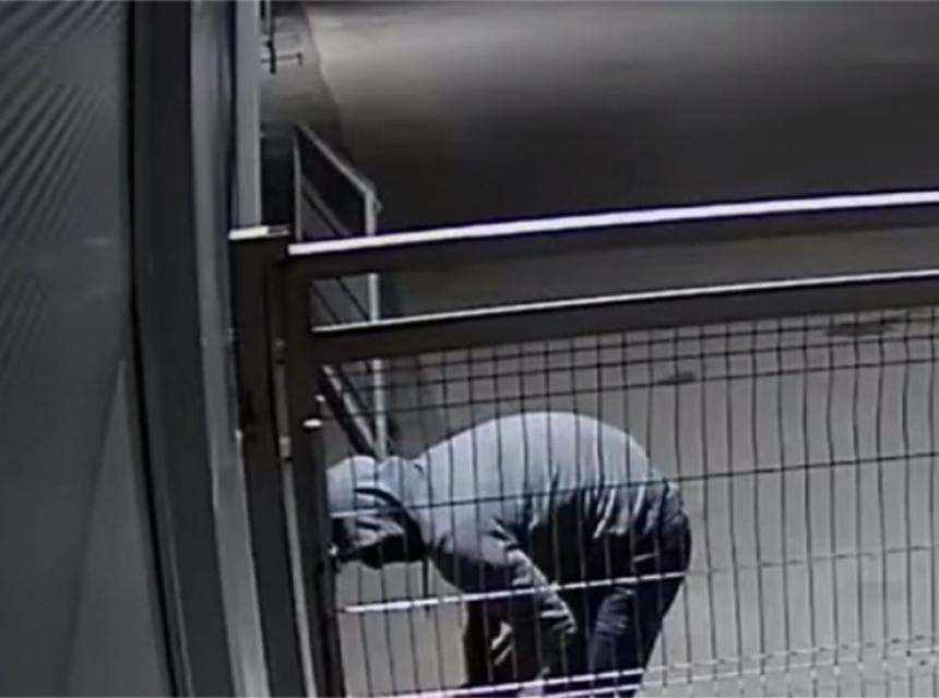 Na snimku se vidi N.N. osoba koja uz pomoć pogodnog alata pokušava da presiječe lanac na kliznoj kapiji baucentra.