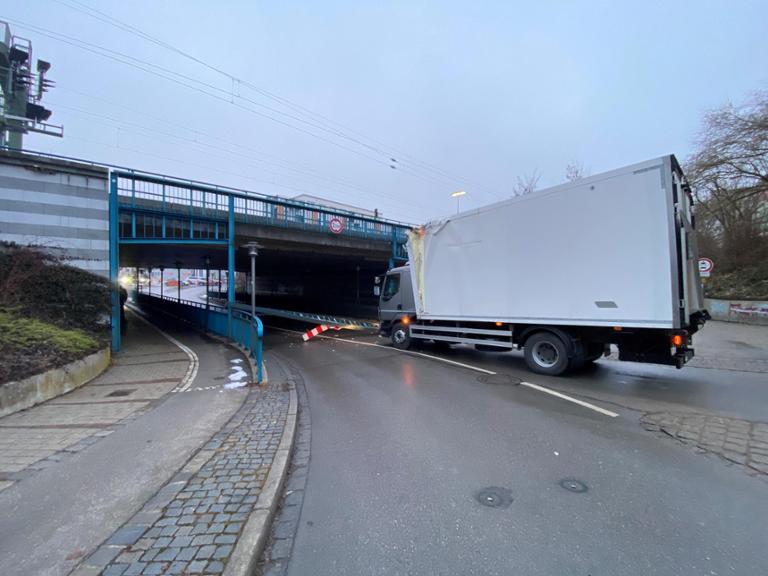 Foto:Policija iz Gautinga/Zu hoch für die Unterführung am Pippinplatz: Der Aufbau dieses Lkw riss einen Stahlträger ab, der die Durchfahrt am Freitagmorgen stundenlang blockierte. © Polizei Gauting