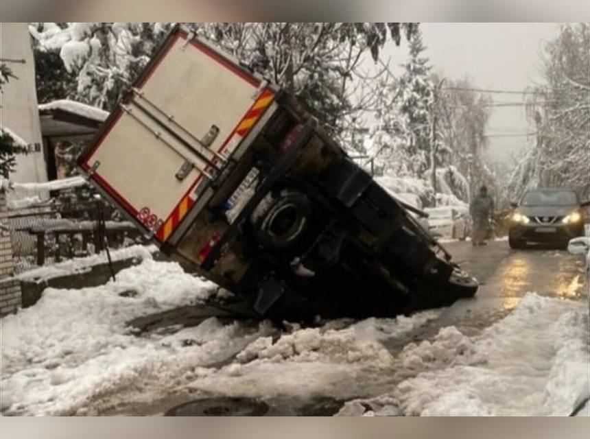 U Kostolačkoj ulici u Beogradu kamion koji je dostavljao robu u obližnji Gerontološki centar propao je kroz ogromnu rupu koja se otvorila u asfaltu na saobraćajnici.