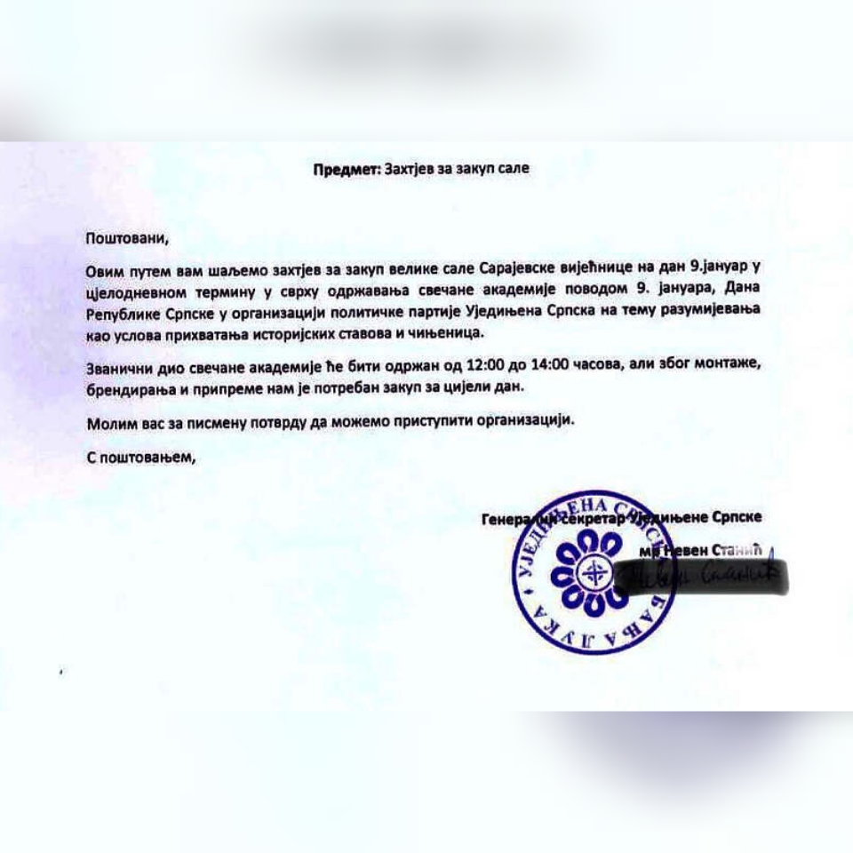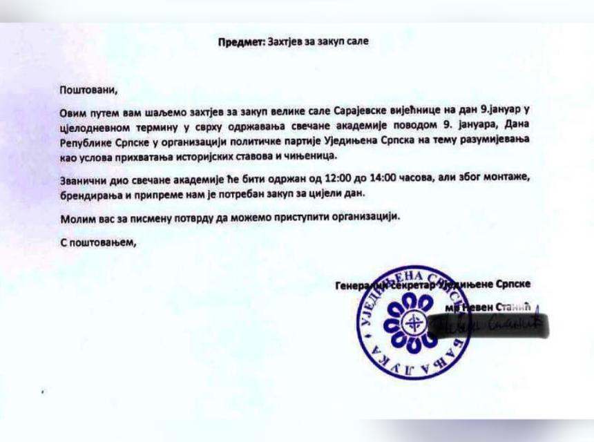 "Politička stranka Ujedinjena Srpska zatražila je održavanje svečane akademije u Vijećnici. Zahtjevu neće biti udovoljeno iz sljedećeg razloga: Kao povod za svečanu akademiju naveden je tzv. dan Republike Srpske (RS), 9. januar. Ustavni sud BiH je u predmetu U 2/18, presudom objavljenom u Službenom glasniku BiH br. 30/19 obilježavanje navedenog datuma kao službenog dana ove administrativne jedinice države BiH proglasio neustavnim, utvrdivši da njegovo obilježavanje "nije u skladu sa članom I/2. Ustava BiH, članom II/4. Ustava BiH u vezi sa članom 1.1. i članom 2.a) i c) Međunarodne konvencije o ukidanju svih oblika rasne diskriminacije i članom 1. Protokola broj 12 uz Evropsku konvenciju, te članom VI/5. Ustava BiH", napisala je Karić.