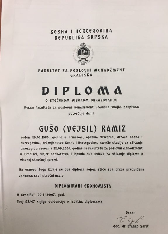 Diplomu je stekao na Fakultetu za poslovni menadžment u Gradišci. Dok je bio NK radnik zarađivao je približno 640 KM, kao diplomirani ekonomista zarađuje skoro 1.900 KM.