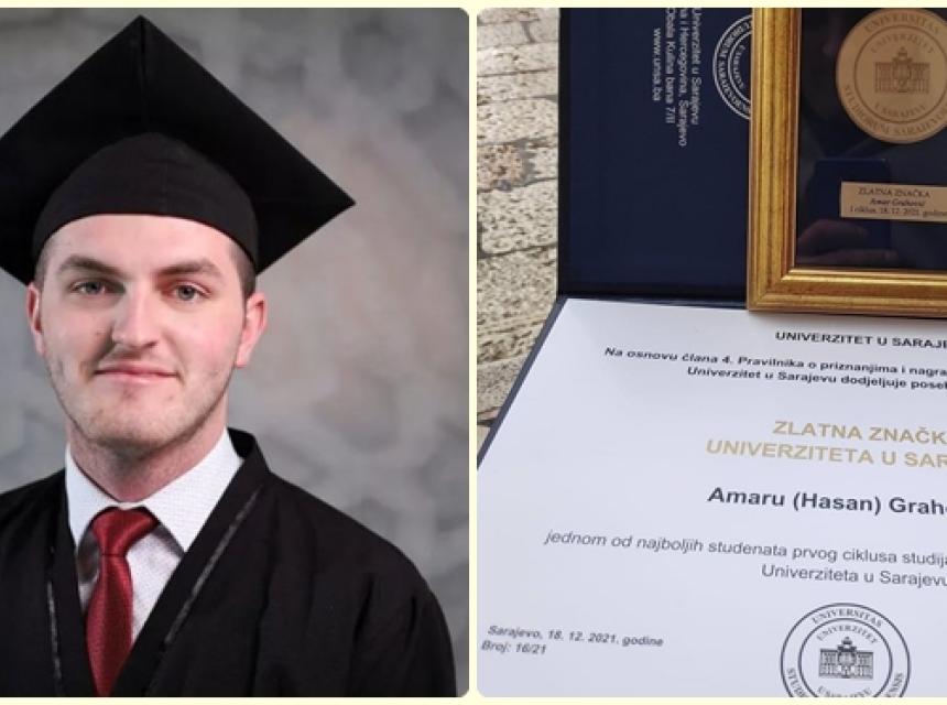 Kladušaninu Amaru Grahoviću prije nekoliko dana dodjeljeno je priznanje „Zlatna značka Univerziteta u Sarajevu“ kao jednom od najboljih studenata prvog ciklusa studija Fakulteta islamskih nauka. Amar je imao prosjek ocjena 9,63 u toku četvorogodišnjeg studija. Amar je završio studijski program „Islamske teologije“. Položio je 48 predmeta, a pored uloge studenta, na fakultetu je bio angažiran i kao student – asistent na katedri za Šerijatsko pravo, te je imao angažman i u biblioteci fakulteta. Amar je upisao i drugi ciklus Master studija na Fakultetu islamskih nauka u Sarajevu, a trenutno honorarno radi u Medresi „Reis Džemaludin ef. Čaušević“ u Cazinu, čiji je i bio učenik prije odlaska na fakultet.