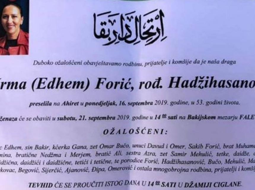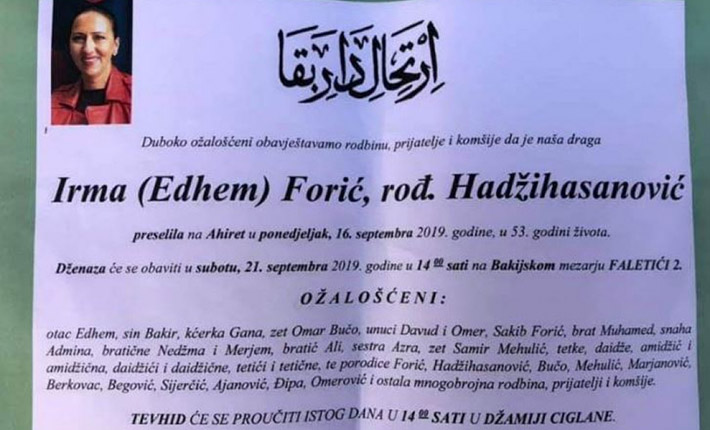 Podsjećamo, beživotno tijelo Irme Forić pronađeno je u stanu u sarajevskom naselju Dobrinja, prenosi Fokus.ba.