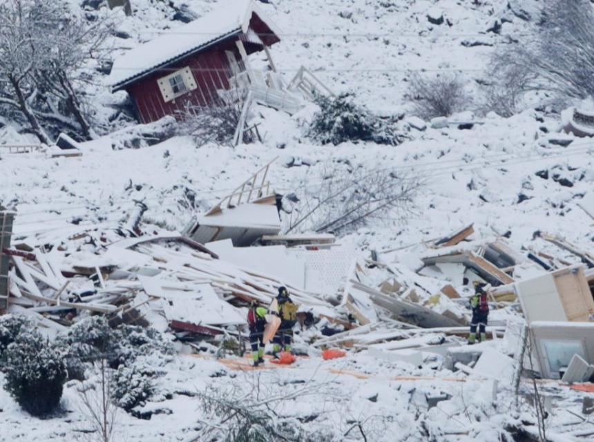U početku se činilo preopasnim na klizište slati spasilačke ekipe, pa je mjesto nesreće – golem krater koji je progutao stambene zgrade u selu Ask – pretraživano iz zraka, helikopterima i uz pomoć dronova.