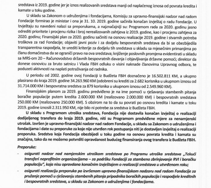 Istakli su da su sredstva koja Fondacija osigura u toku godine na osnovu povrata kredita i kamata značajna, a da revizori ne mogu potvrditi opravdanost budućeg finansiranja ovog transfera iz budžeta FBiH.