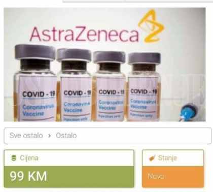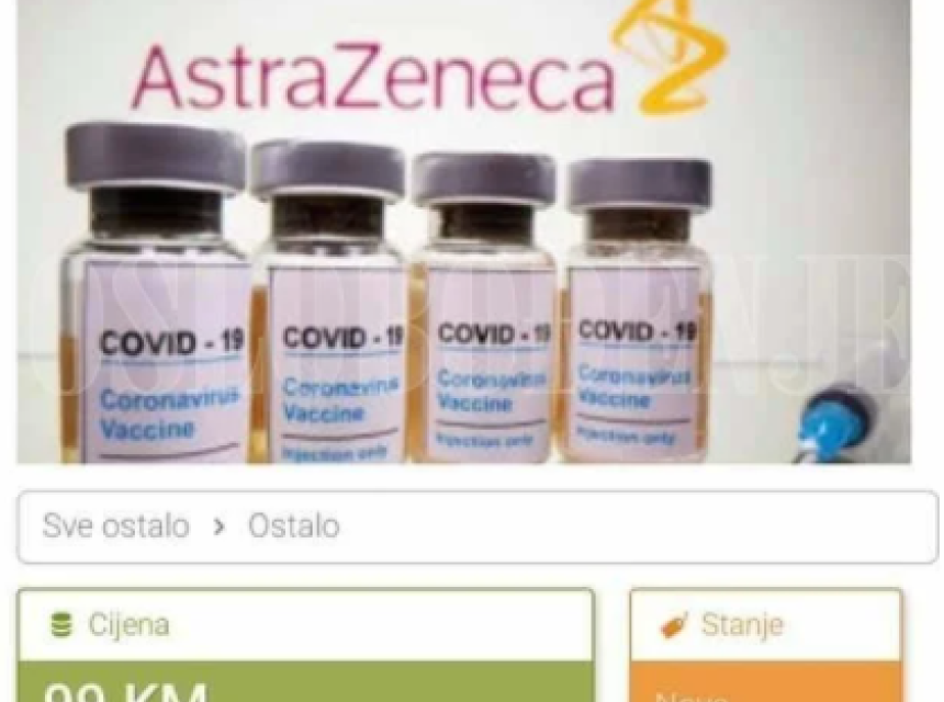 No, osim doniranih vakcina, pojavile su se i vakcine na jednoj od najvećih online prodajnih paltformi u BiH. Oglas za vakcinu osvanuo je na OLX. ba stranici. Iako je ekspresno uklonjen, Oslobođenje je u posjedu fotografija na kojim se nudi vakcina proizvođača AstraZeneca, i to po cijeni od čak 99KM. Informacije o količini vakcina koje se prodaju nisu bile dostupne.