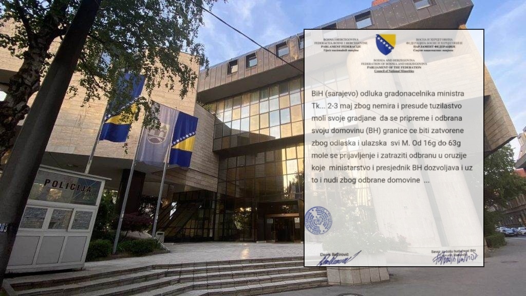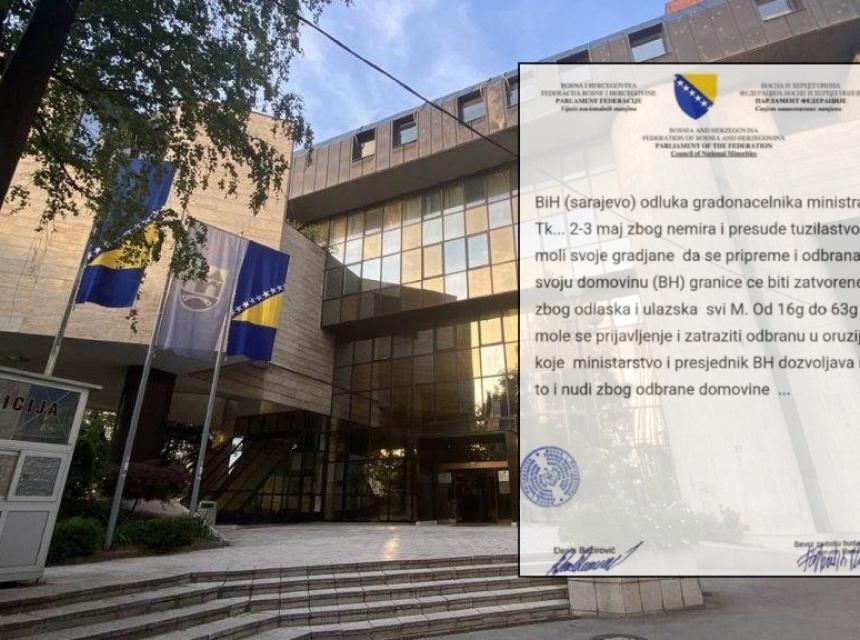 Na društvenoj mreži “X” krajem aprila također je objavljen dokument na memorandumu Parlamenta Federacije, a čiji su navodni potpisnici Denis Bećirević i Fahrudin Radončić, u kojem se građani upozoravaju da preuzmu oružje i da se pripreme na odbranu države, te obavještavaju da će granice biti zatvorene 2. i 3. maja.