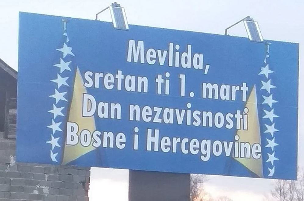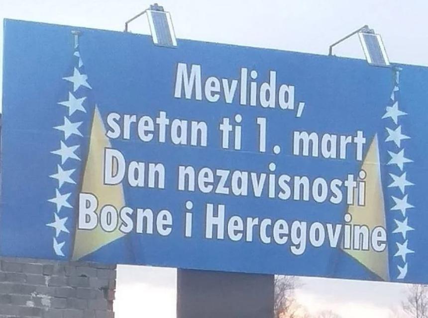 "Mevlida, sretan ti 1. mart Dan nezavisnosti Bosne i Hercegovine“, napisano je na panou pored puta u Doboj Istoku.