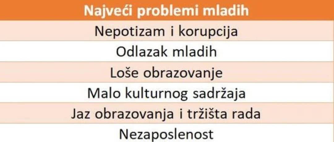 Glavni problemi koje mladi smatraju prioritetnim za rješavanje, rangirani prema broju osoba koje su istakli to pitanje, su nepotizam i korupcija, odlazak mladih, loše obrazovanje, malo kulturnog sadržaja, jaz obrazovanja i tržišta rada i nezaposlenost.