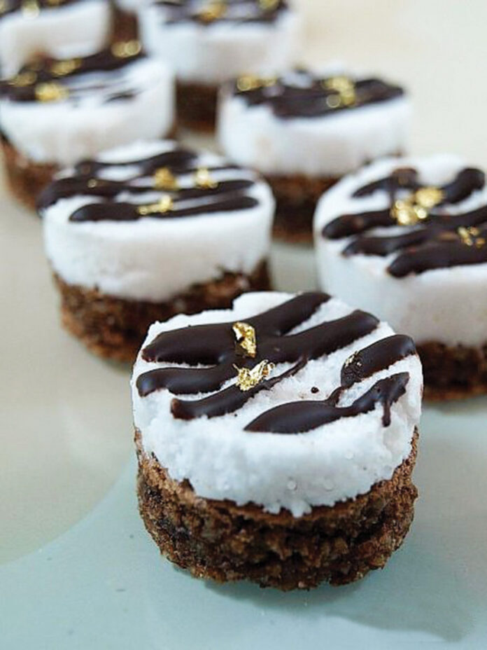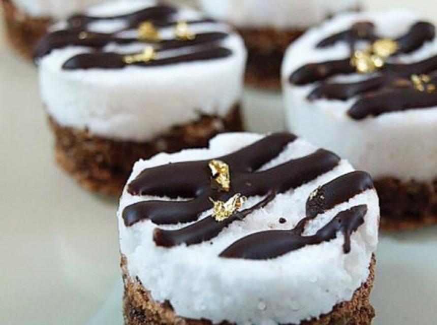 PRIPREMA: U lončić stavite vodu i šećer pa sklonite s vatre neposredno prije nego će proključati, stalno miješajući. Dodajte u to kokosovo ulje i ostavite da se ohladi. Kad se stisnulo, sve izmiksati da se pretvori u “snijeg”. Za tijesto razdvojiti jaja, bjelanjke istući i postepeno dodavati šećer, pa onda dodati žumanjke, zatim mješavinu brašna i kakaa, te lješnjake. U pleh obložen papirom istresite tijesto i pecite ga na 180 °C oko 15 minuta. Kada je gotovo, modlom ili čašicom vadite okrugle oblike i dok su još u modli dodajte na tijesto kašičicu fila. Na dobro ohlađene kolačiće stavite mlazić čokoladne glazure i malo jestivog zlata.