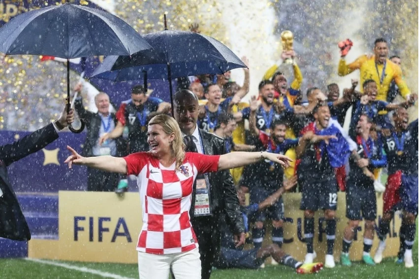Predsjednica Republike Hrvatske Kolinda Grabar-Kitarović bila je u centru pažnje na ceremoniji dodjele medalja nakon finalnog meča Svjetskog prvenstva u Rusiji s obzirom na to da je srdačno grlila i ljubila sve koji su se našli u njenoj blizini, od igrača Hrvatske i Francuske pa sve do sudija i političkih zvaničnika.