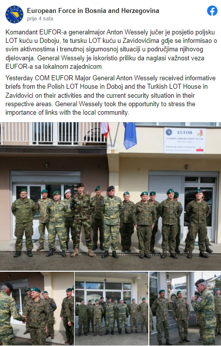 Komandant EUFOR-a generalmajor Anton Wessely jučer je posjetio poljsku LOT kuću u Doboju, te tursku LOT kuću u Zavidovićima gdje se informisao o svim aktivnostima i trenutnoj sigurnosnoj situaciji u područjima njihovog djelovanja.