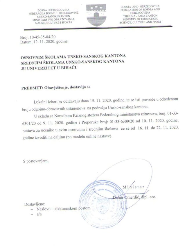 Na osnovu Naredbe Kriznog štaba Federalnog ministarstva zdravstva i obavijesti ministarstva obrazovanja USK, u periodu od 16.11.2020. do 20.11.2020. godine nastava će se na području našeg kantona odvijati online putem ZOOM aplikacije.