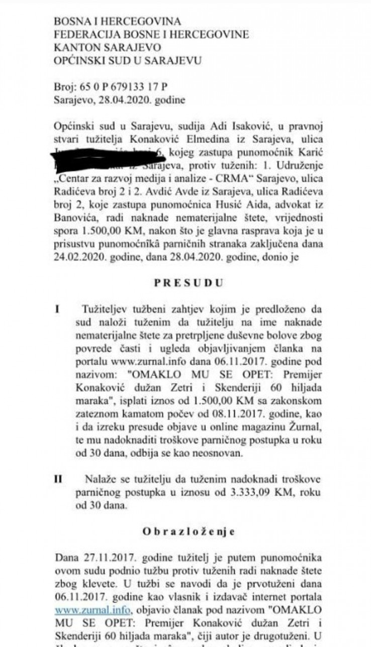 Općinski sud u Sarajevu donio je 28.aprila ove godine presudu (65 0 P 679133 P) kojom je odbijena kao neosnovana tužba Elmedina Konakovića, lidera Naroda i Pravde protiv internet portala "Žurnal" i novinara Avde Avdića, a zbog objavljenog teksta od 6.novembra 2017.godine pod nazivom: OMAKLO MU SU OPET: "Premijer Konaković dužan Zetri i Skenderiji 60.000 KM"