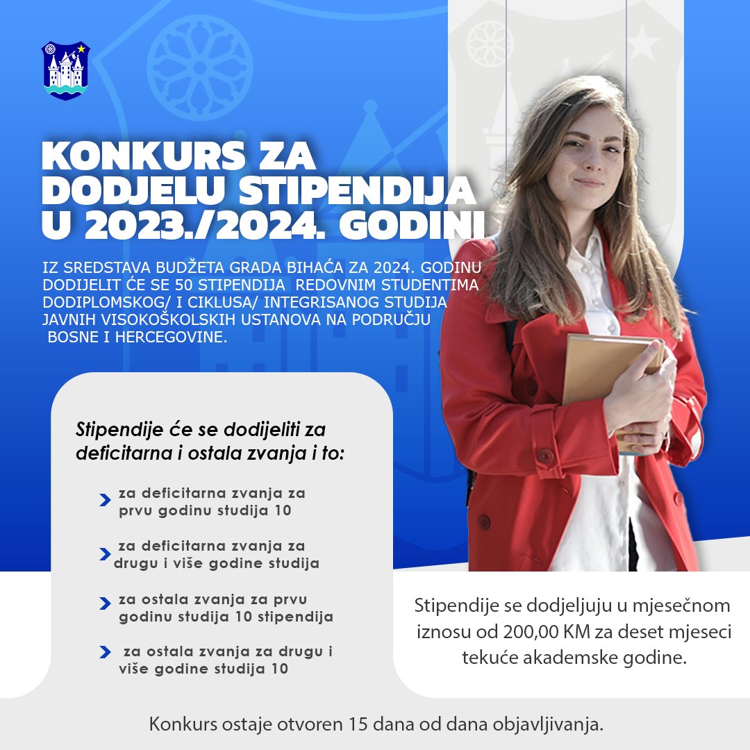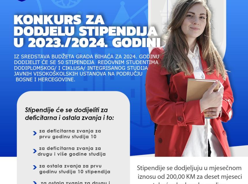 Grad Bihać raspisao je konkurs za dodijelu 50 stipendija redovnim studentima dodiplomskog/ I ciklusa/ integrisanog studija javnih visokoškolskih ustanova na području Bosne i Hercegovine.